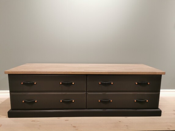 Elvegård 2x2 kommode/tv-bord/skjenk. Her avbildet i Dempet sort og eikeplate med osmo skifer hardvoksolje.