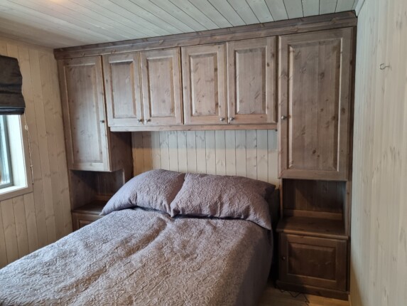 Elvegård plassbygd garderobeomramming, vegg til vegg og gulv til tak, tilpasset kontinentalseng.