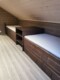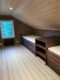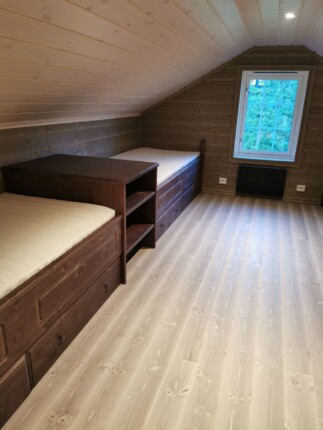 Her er det bygget sammen 2 senger med reol/nattbord på hver side av rommet. En god plassutnyttelse og 4 sengeplasser.