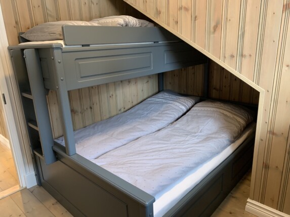 Her var utfordringen å plassere en familiekøye under ett skråtak. vi senket høyde mellom etasjer og fra gulv til 1.etg. Fjernet fot og hodegavel og flyttet stigen til kortenden for å gjøre tilgangen til 1.etasje enklere.