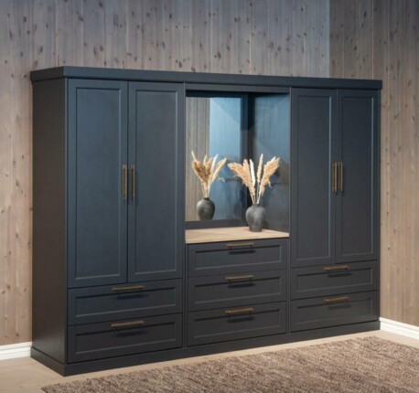 Åsgård 4-dørs garderobe med skuffer, kommode og speil i midten, her avbildet i Dempet sort med Manor håndtak i antikk messing.