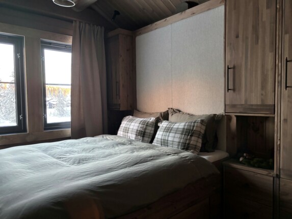 Åsgård hovedseng med ekstra høy hodegavel og sideskap fra omramming. Farge osmo terra.