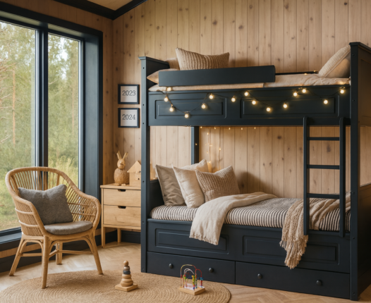 Køyesengen leveres standard som 75, 80 eller 90. Det er mulig med 120/120 eller 150/150. Utvendig mål +10cm. H185.