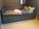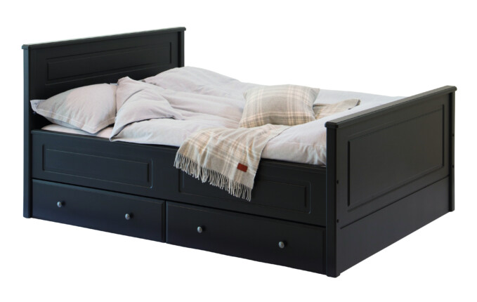 Elvegård seng, avbildet i Dempet sort. Leveres i breddene 75, 80, 90, 120, 150, 160 og 180 cm. Lengde 200 cm og høyde 103 cm. Yttermål +10 cm.