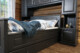 Elvegård garderobeomramming sammen med Elvegård seng 150cm. Omrammingen er tilpasset våre senger på 150, 160 og 180 cm. Den passer også til kontinentalsenger, og kan tilpasses på mål. Garderobeomrammingen kan bygges fra vegg til vegg, og fra gulv til tak. Her er møblene avbildet i Dempet sort, og de kan leveres i alle våre standardfarger og spesialfarger etter eget ønske.