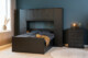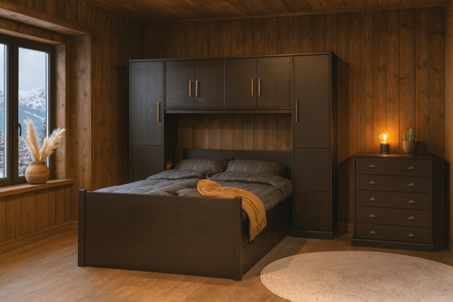 Holmgård garderobeomramming sammen med Holmgård seng 150cm. Omrammingen er tilpasset våre senger på 150, 160 og 180 cm. Den passer også til kontinentalsenger, og kan tilpasses på mål. Garderobeomrammingen kan bygges fra vegg til vegg, og fra gulv til tak. Omrammingen har skjult innebygd nattbord inn fra siden. Her er møblene avbildet i Kullsort beis, og de kan leveres i alle våre standardfarger og spesialfarger etter eget ønske.