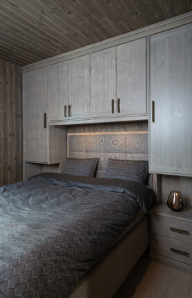 Her viser vi ett eksempel på plassbygd garderobeomramming rundt kontinentalseng. Bygd vegg til vegg og gulv til tak. Steingrå med Manor håndtak i antikk messing.