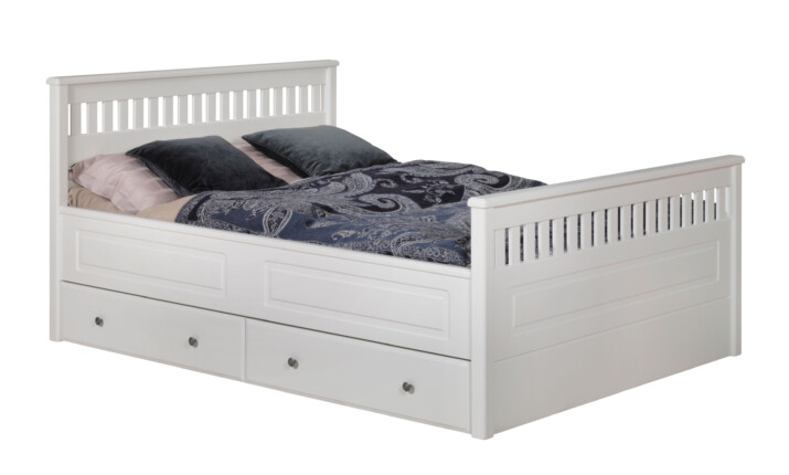 Lysgård seng med garderobeomramming. 3 skuffer i nattbord. klassisk hvit