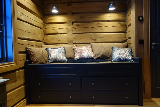 Holmgård plassbygd hemsseng med nattbord og skuffer under seng.