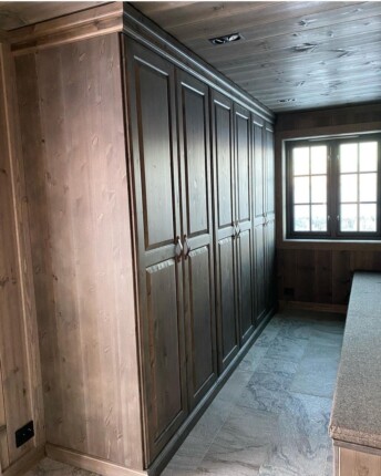 Elvegård gardeobeskap etter kundens ønsker og mål, beiset i samme farge som vegger.