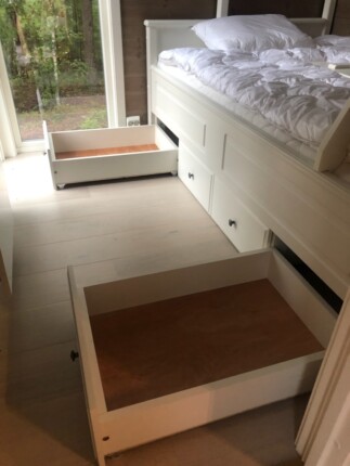 Holmgård plassbygd hemsseng med nattbord og skuffer under seng.