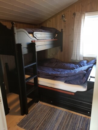 Fjellgård L-seng i sort aldringsmalt. Hovedseng montert vegg til vegg og hjørnemontert overkøye. Nattbordkasse i hodegavel for å fylle ut lengde over 2 meter.