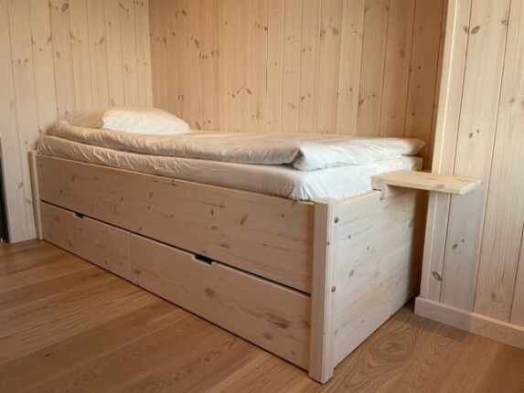 Holmgård plassbygd hemsseng med nattbord og skuffer under seng.