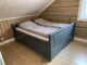 Holmgård plassbygd hemsseng med nattbord og skuffer under seng.