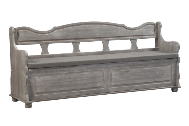 Slagbenken har masse oppbevaringsplass under setet. Her i rød aldringsmalt utførelse.