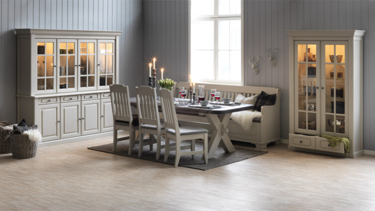 Spisestue bestående av Nygård spisebord, Storgård spisestoler og Storgård slagbenk. Bord og benk er i farge sand med tømmerbrun plate. Stoler med stoffsete i Fjordvik 64 fra Innvik Sellgren. Bordet leveres i standardlengder på 170, 220, 270 og 330 x 100 cm. Bordet kan også leveres med tilleggsklaff på 40 cm. Leveres i alle mulige farger og stoff. Kan også leveres på spesialmål. Skapene på bildet er Nygård 4-dørs framskap og Nygård 2-dørs vitrineskap.