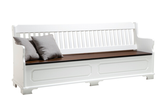 Storgård, Herregård, Nygård slagbenk. Her avbildet i egghvit og sort (bilde 2) med provence antikk seteplate. Leveres i utvendige mål på 180, 230 og 290 cm, D: 63cm, H:94 cm. Benken kan leveres med løs pute som er 5 cm tykk.